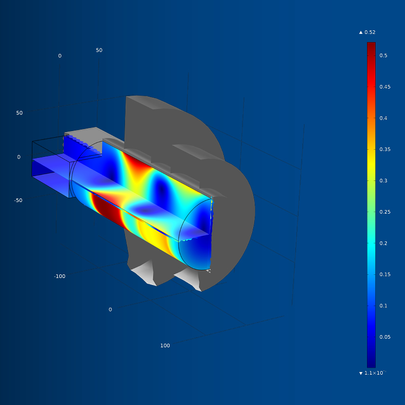 The image on the left shows the temperature distribution in an EBIS-C1 under full load. The EBIS-C1 is an electron beam ion source (EBIS) and, unlike most sources of this type, is completely air-cooled. This visualization was created using COMSOL Multiphysics.