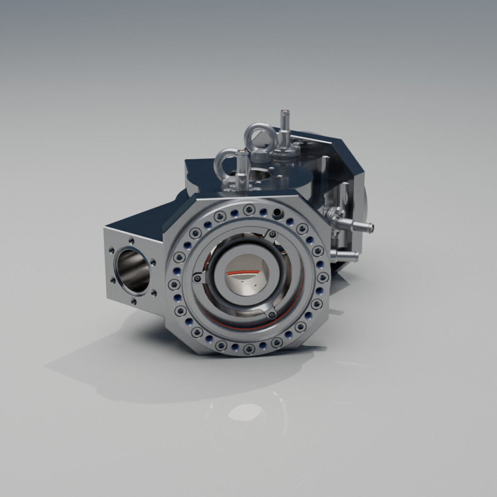 Centrally mounted on a CF100 flange, our neutral particle filter removes neutral particles from a particle beam. It operates by using electric fields to deflect charged particles along a bent beamline path while guiding neutral particles into a beam dump.